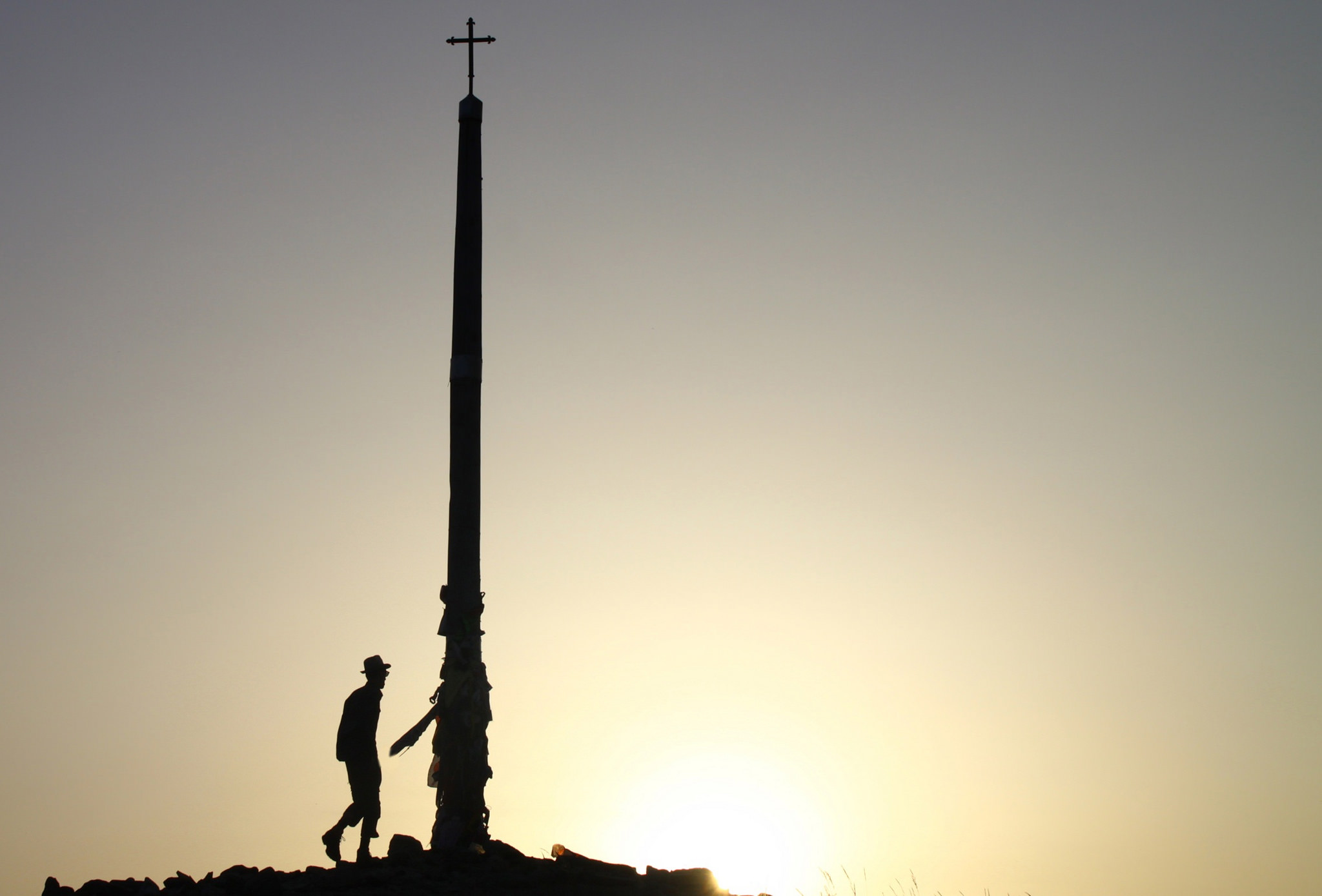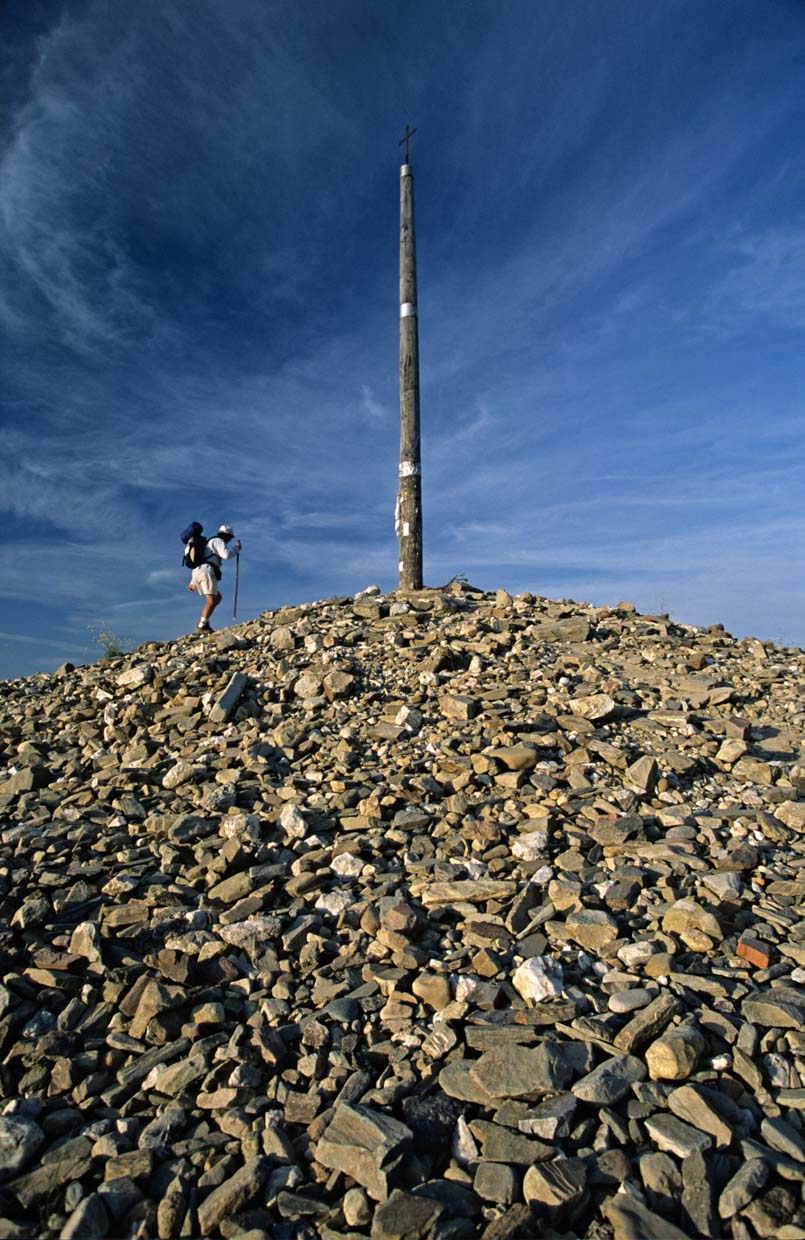 De nuevo en la carretera, seguimos subiendo durante 600 m para llegar a la mítica Cruz de Ferro, donde siguiendo la tradición jacobea debemos dejar a sus pies una piedra con la que hayamos cargado durante todo nuestro peregrinaje.