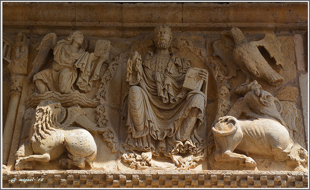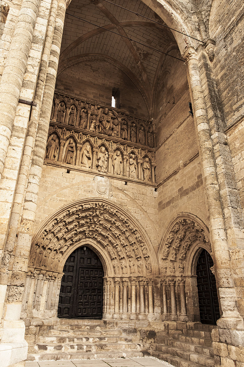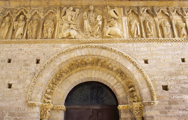 Sobre la puerta vemos un friso que puede recordarnos al que vimos hoy previamente en Villalcázar de Sirga, con un Cristo Pantócrator en el medio. Este está rodeado de los cuatro apóstoles representados como sus símbolos: Mateo es un ángel, Marcos un león, Lucas un toro y Juan un águila. A los lados se representa a los apóstoles, en grupos de seis.