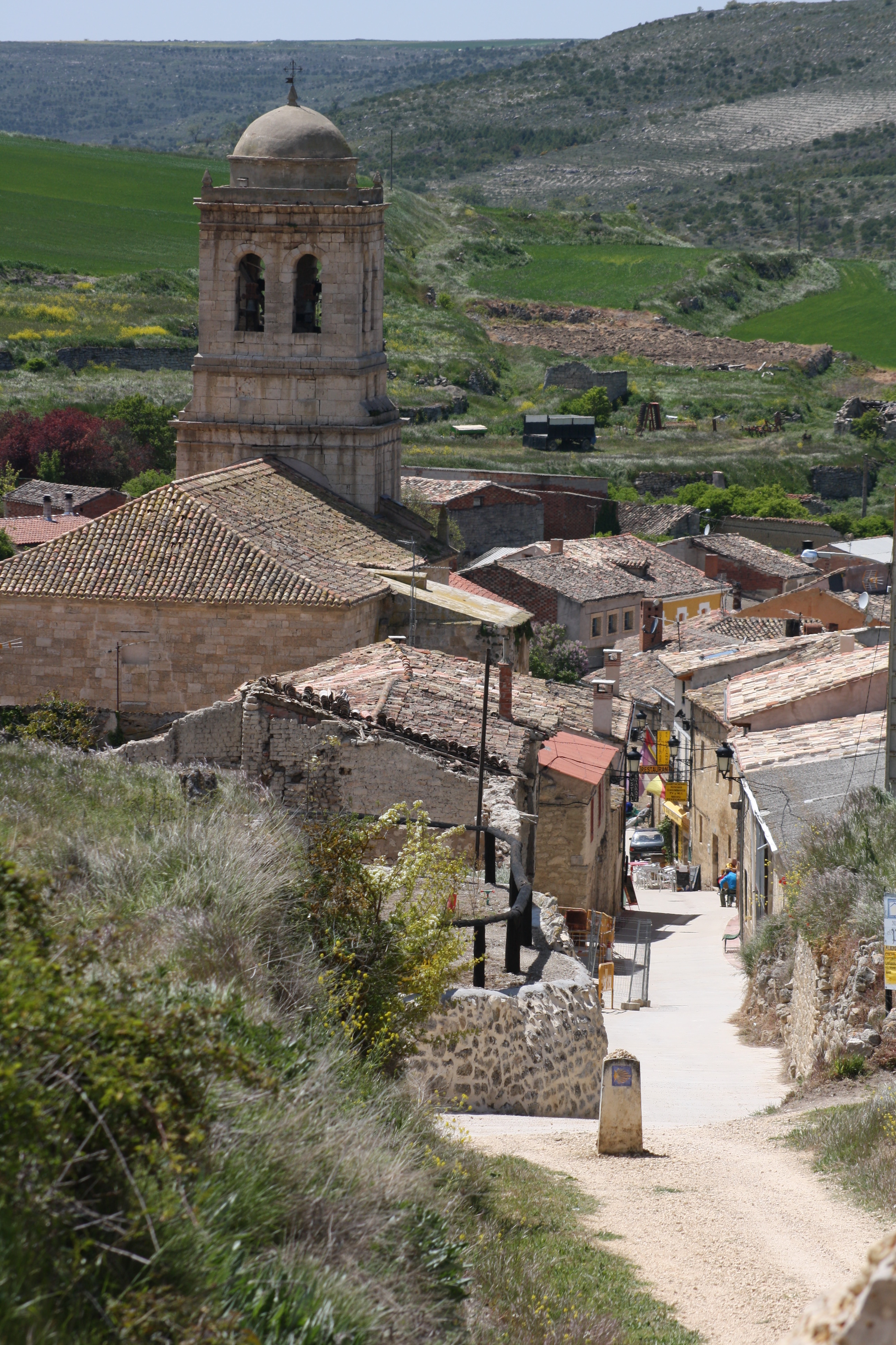 Llegamos así a nuestro kilómetro 21 de etapa, Hornillos del Camino, con un urbanismo jacobeo prototípico. Su calle mayor coincide con el Camino Francés y discurre exactamente de este a oeste. Hoy cuenta con todos los servicios y, como es corriente en este tipo de localidades, su iglesia destaca en altura y tamaño entre las pequeñas casas de dos pisos. Antiguamente tenía un hospital para peregrinos que fue fundado en el S. XII por el rey. Posteriormente, el monarca cedió todo el pueblo a un monasterio benedictino francés.