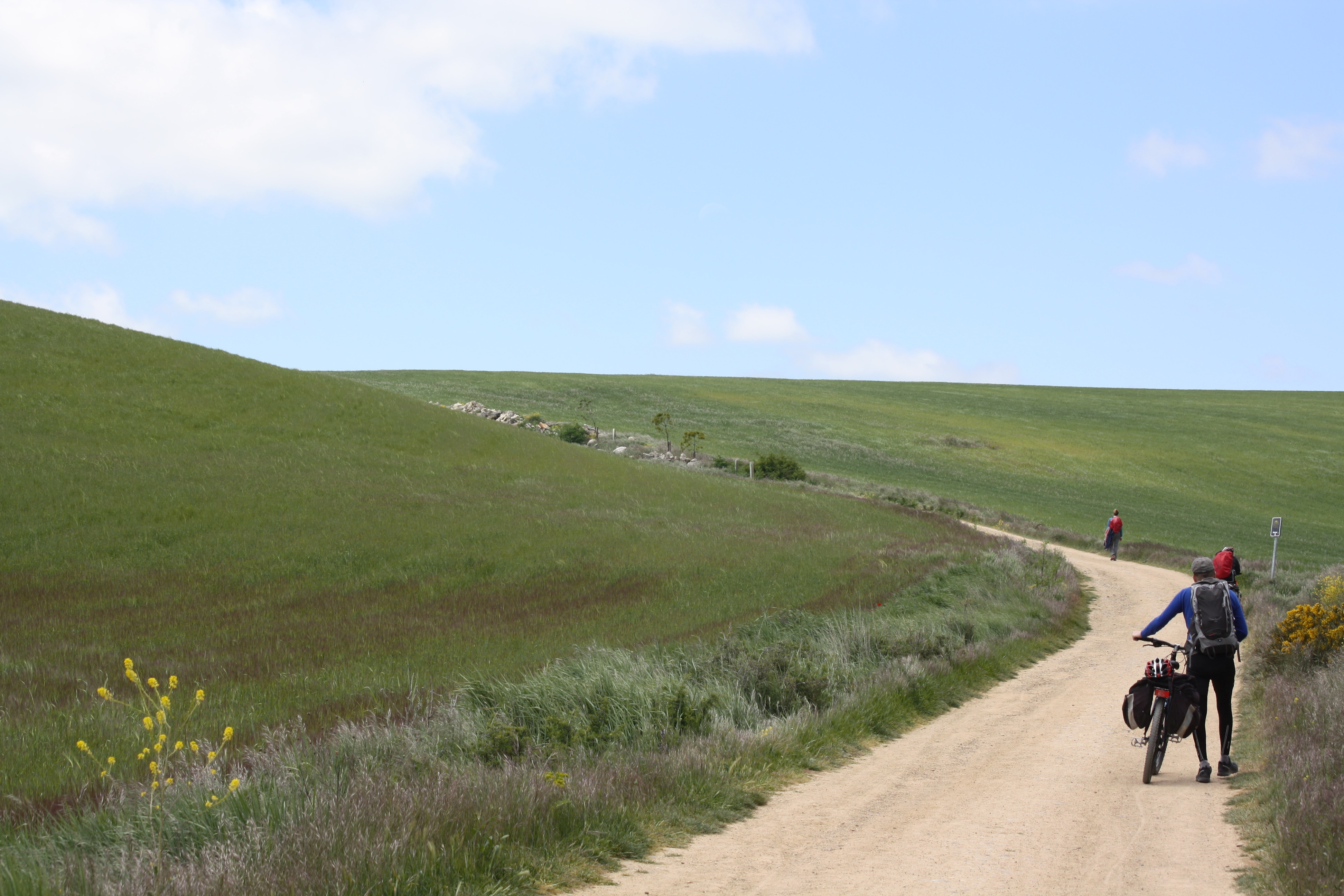 A la salida de Hontanas las flechas indican el cruce de la carretera para coger un sendero que sigue por la ladera de una colina y que en 4 km nos devuelve de nuevo a la carretera. Dado que el sendero es estrecho y no tiene ningún tipo de muro de seguridad para evitar la caída por la colina, recomendamos obviar las flechas a la salida de Hontanas y en vez de cruzar la carretera seguir por ella directamente hasta Castrojeriz. Eso sí, precaución porque es una carretera estrecha y de doble sentido que, al final, deberemos compartir también con los peregrinos a pie.