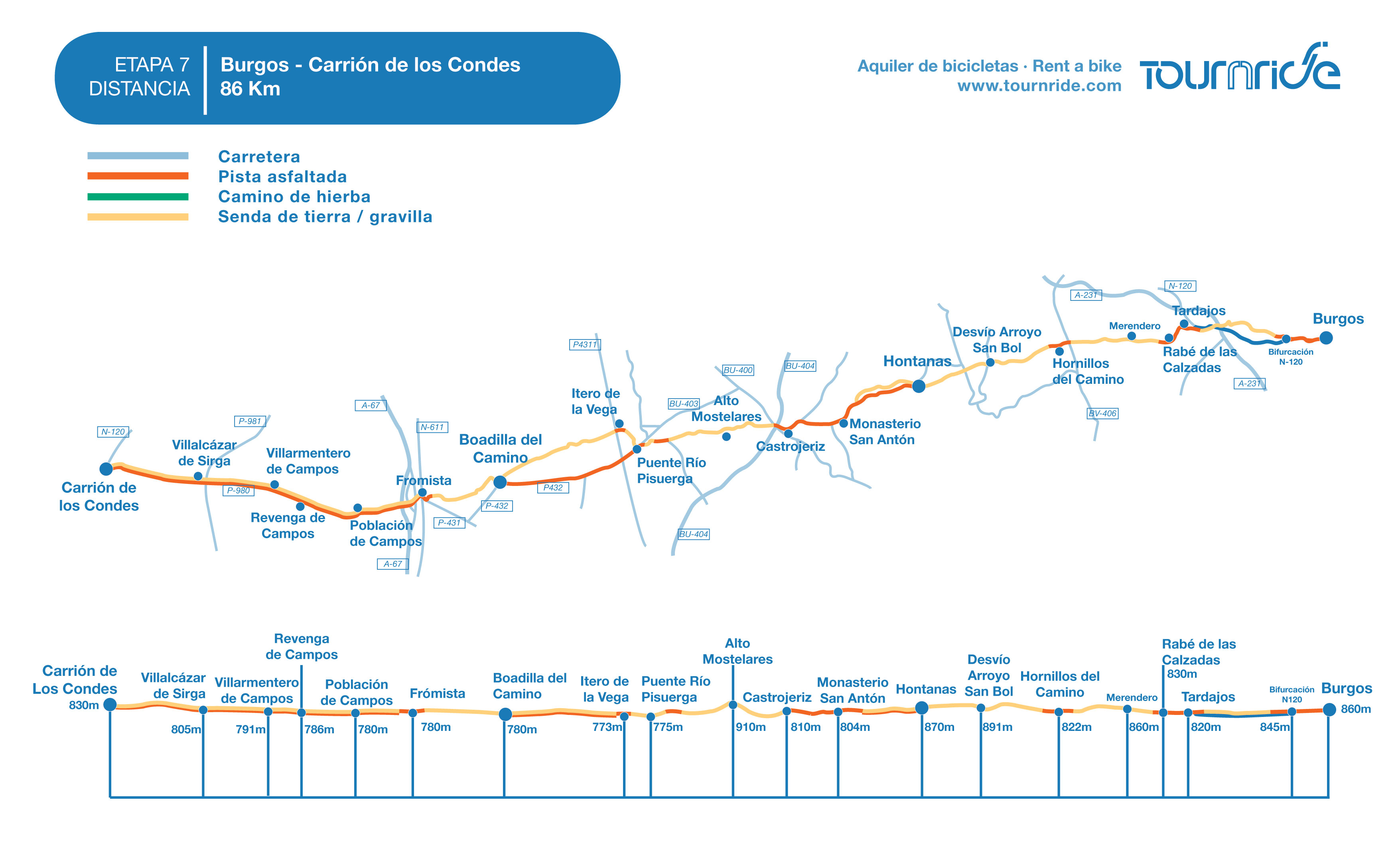 En general, la etapa 7 de Burgos a Carrión de los Condes es larga y se caracteriza por pistas entre campos de cereal, uniendo poblaciones separadas por distancias de entre 5 y 11 km. La excepción es la parte final, entre Frómista y Carrión de los Condes, más poblada y por carretera comarcal. El perfil de la etapa del Camino de Santiago en bicicleta no tiene complicaciones salvo en la subida y bajada al Alto de Mostelares, en donde debemos extremar la precaución.