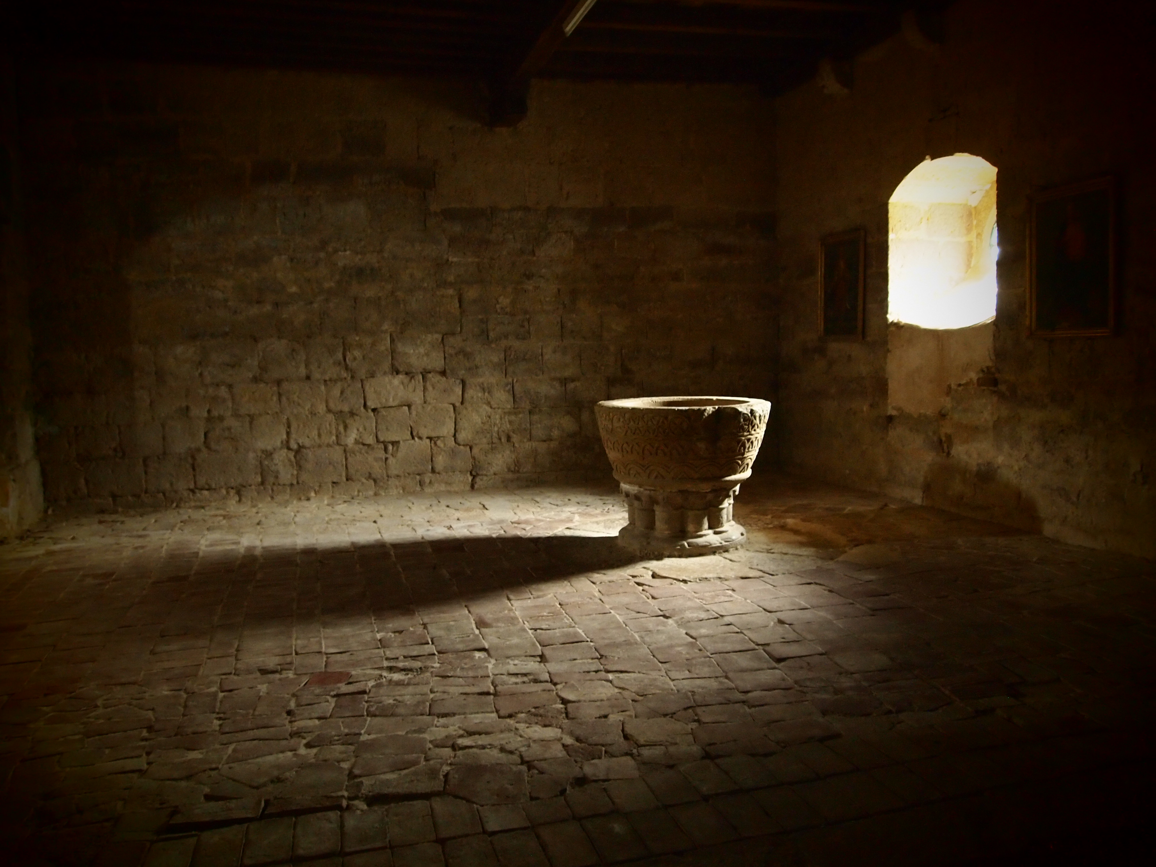Bajo el arco, dos columnas con capiteles tallados enmarcan la puerta. En el de la izquierda vemos el Bien, en forma de dos protectores que impiden que un león (el demonio) se lleve el alma de una persona mientras la llevan al cielo. En el de la derecha, en cambio, se representa lo contrario: el Mal como la tortura de un hombre desnudo al que unos perros muerden permanentemente sin llegar a matarlo nunca.
