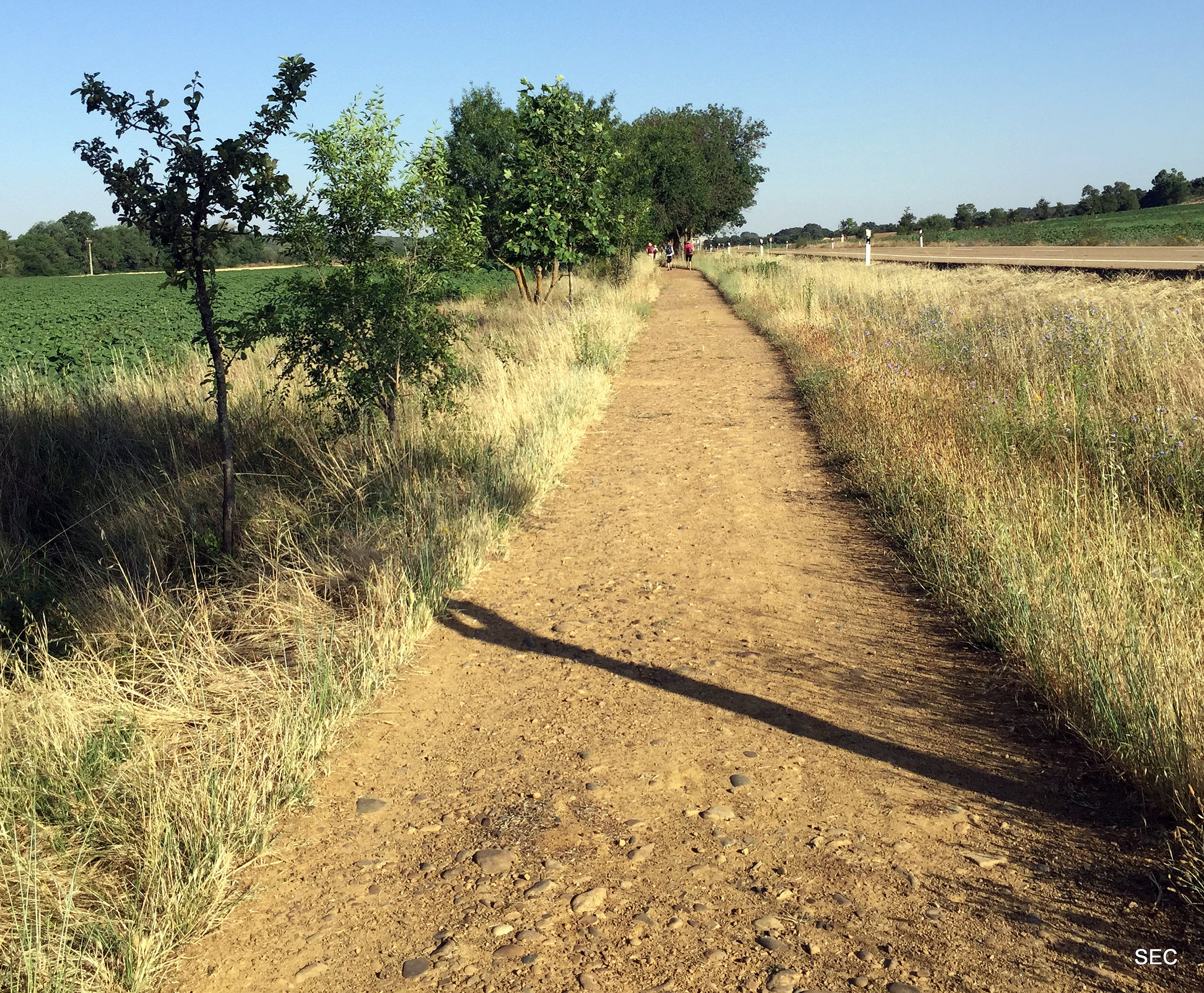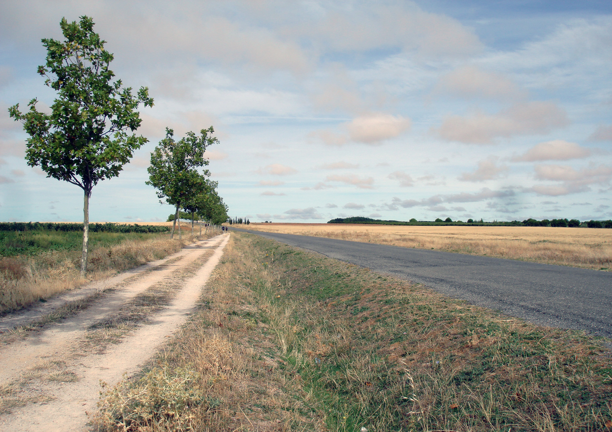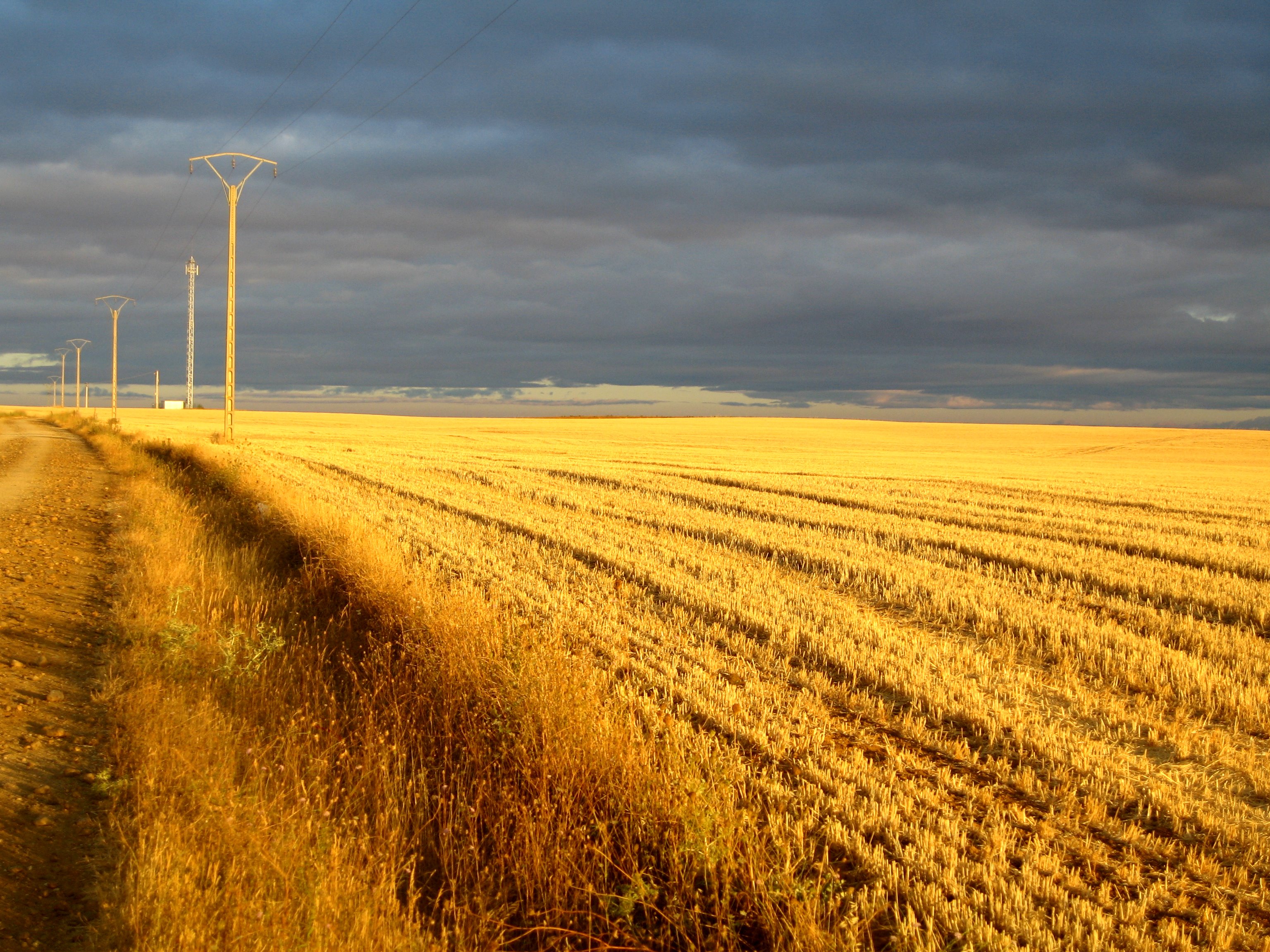 The PP-2411 turns to right, but we continue forward by a land path which coincides with the old roman via Aquitana. This is a straight line of 11 km between fields, in a flat profile with a light positive slope at the end. This creates a gradient change that blocks us from seeing Calzadilla de la Cueza until we practically arrive there.