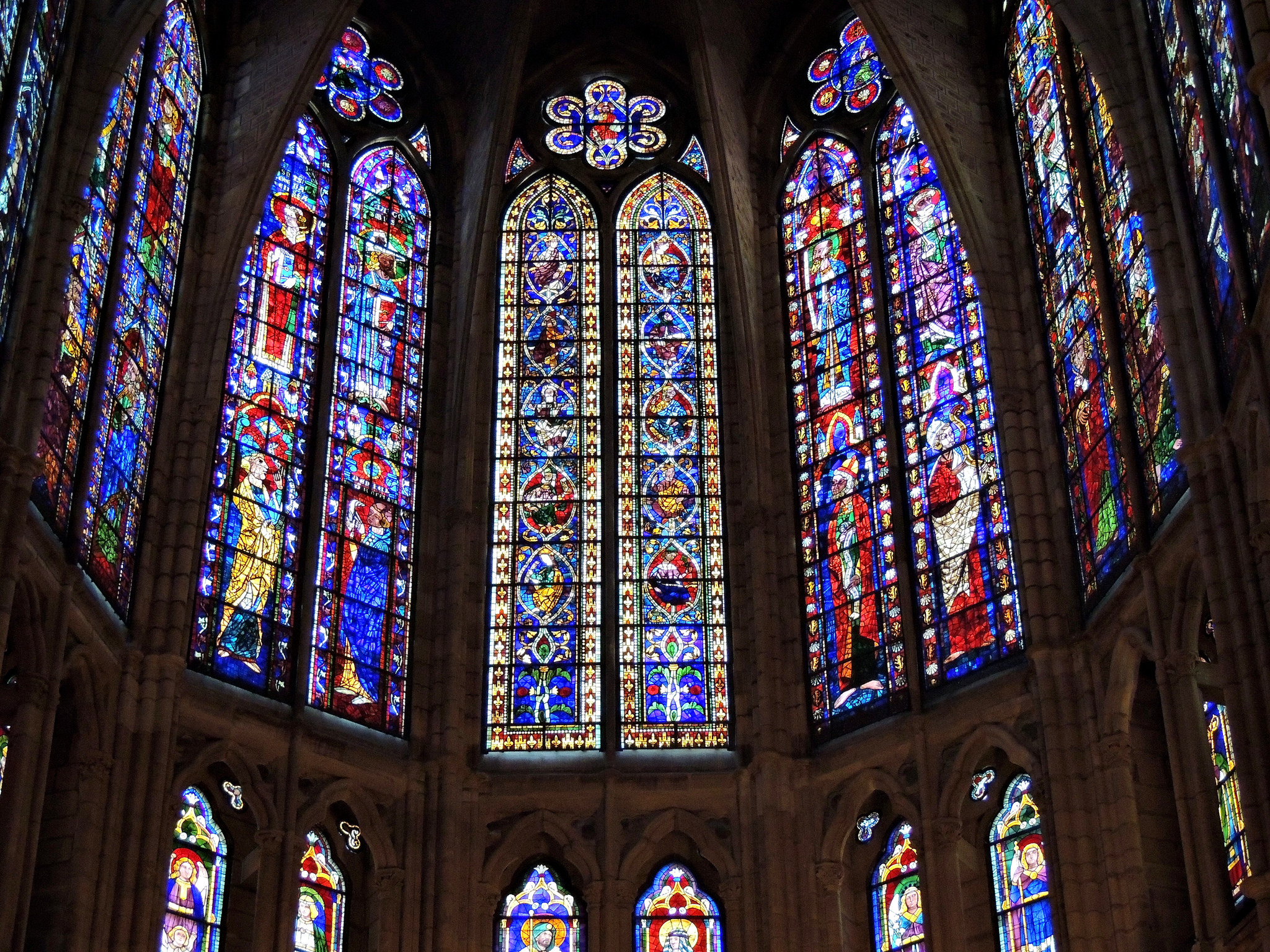 SWithout any doubt, the most impressive thing about this Cathedral are its glass vitrines, without taking credit away from the details in its stone sculpture or the amazing height of its walls and towers. Being put in a radiant gothic stylish frame, its tripartite elevation opens the walls all over its parts to insert polychromatic stained glassed window that paint the inside of the temple with multi-colored lights.