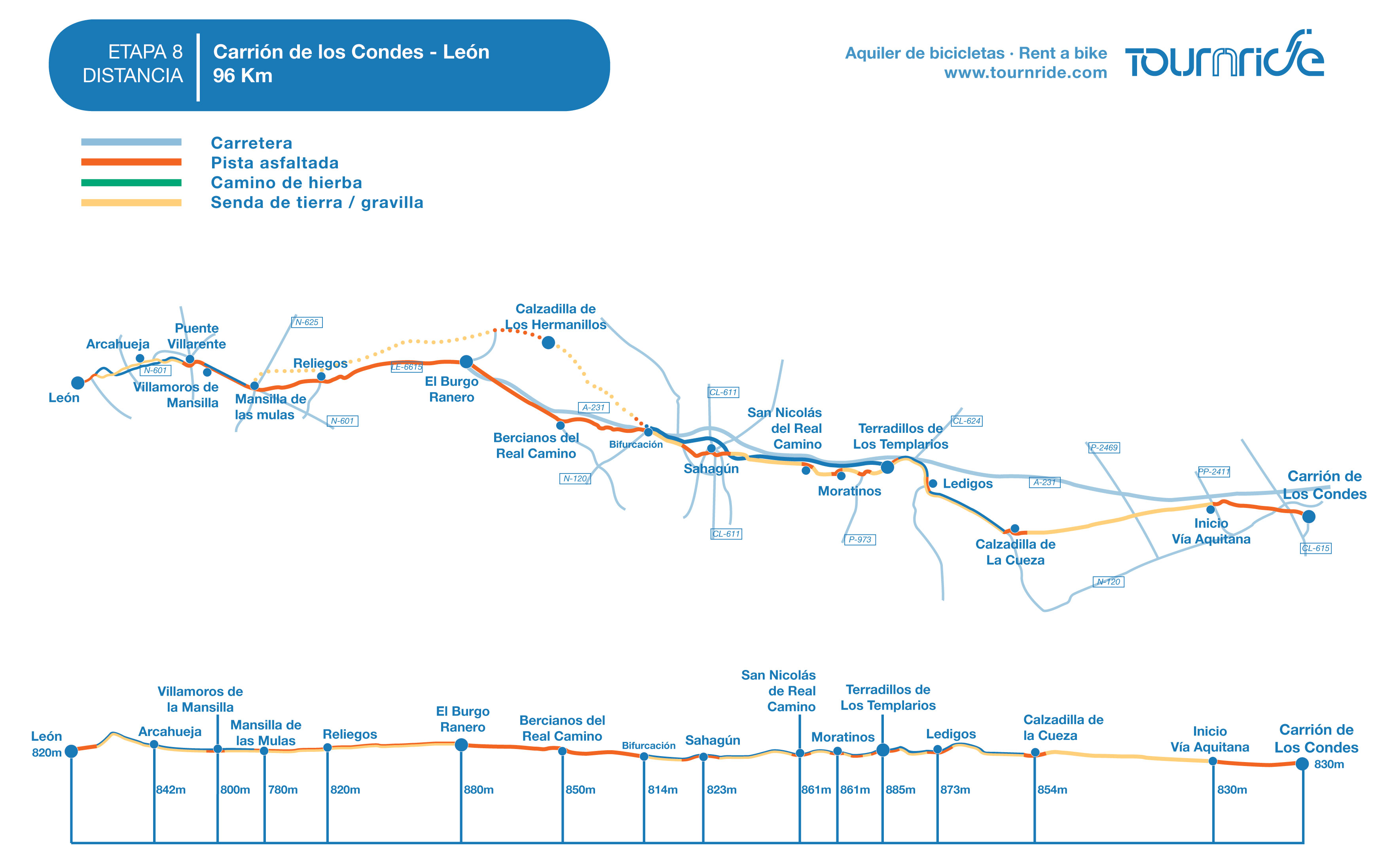 If you think this stage is too long for you, Tournride recommends you taking a rest in Reliegos (km 69 of stage), Mansilla de las Mulas (km 75) or Puente Villarente (km 82); where you can find all the services that you need.